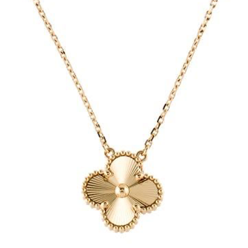 Celebrate the symbol of good fortune with this beautifully crafted clover pendant necklace. Featuring a refined four-leaf clover design, this piece is detailed with a radiant guilloché finish that creates a stunning sunburst effect. The textured gold-tone surface captures and reflects light from every angle, while a delicate beaded border adds a timeless, sophisticated touch.